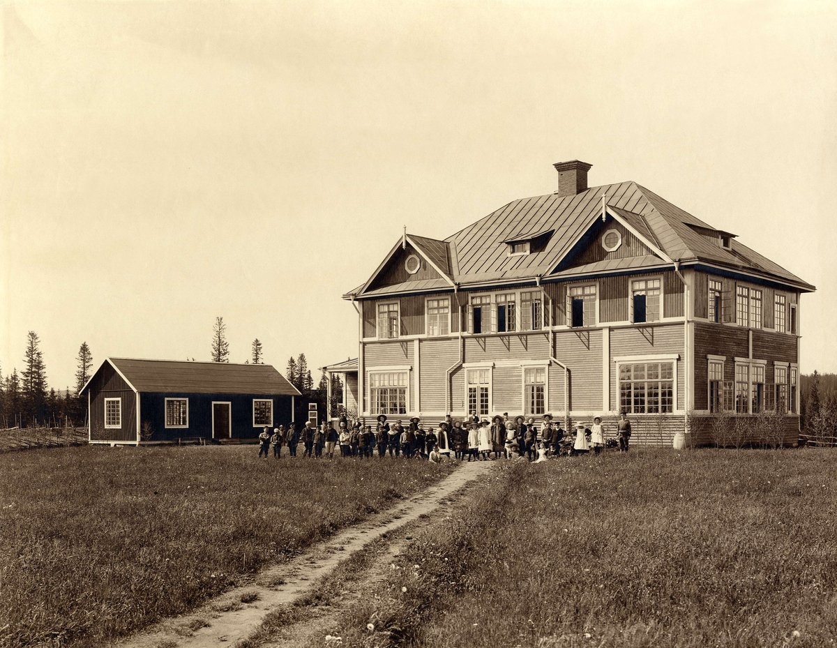 Titel: Barn samlade utanför fjällkolonin "Fjällåsen" i Ånn