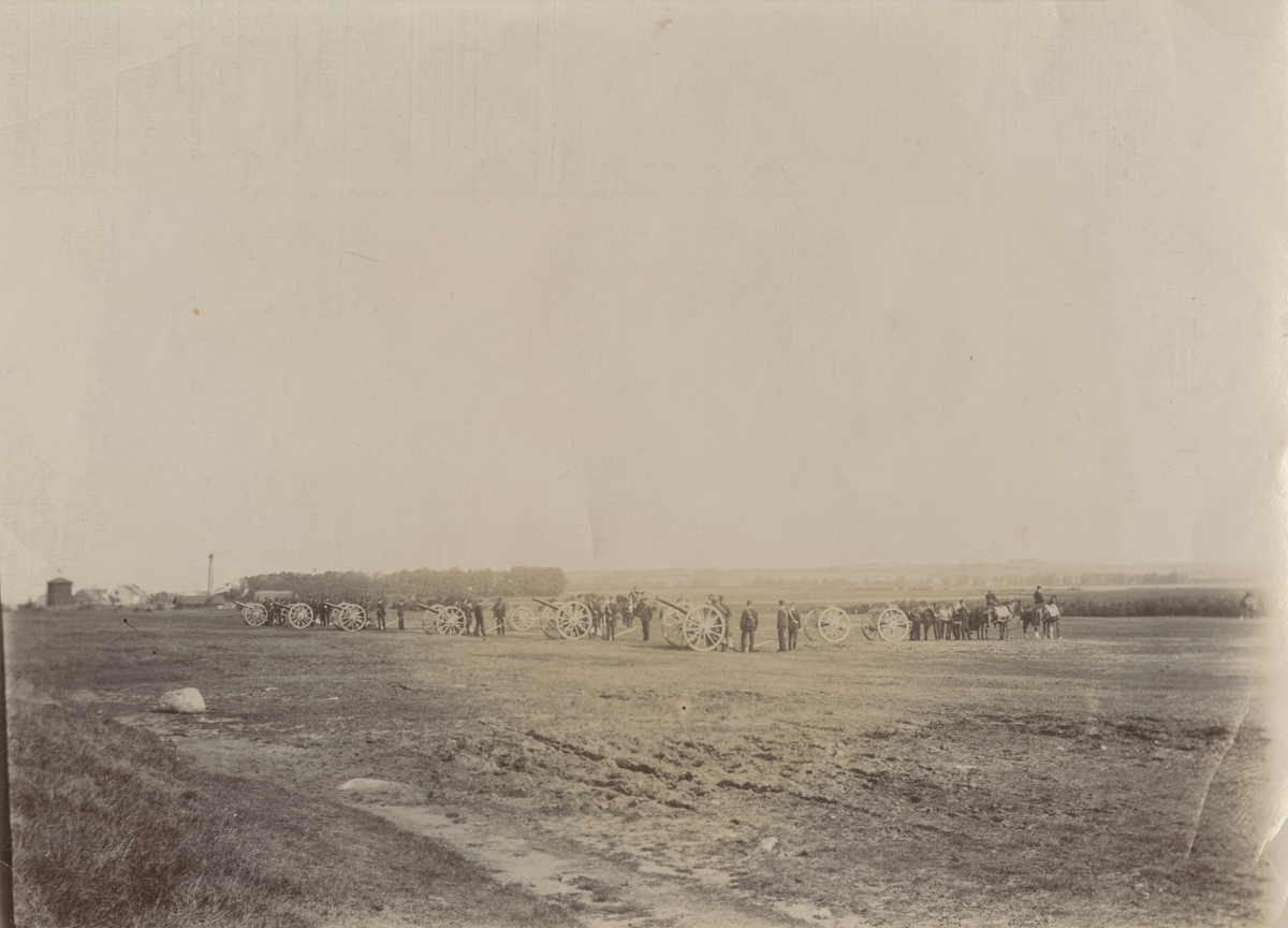Rad med 8,4 cm kanoner m/1881 i hög elevation på en leråker. Artillerispann syns längre bak.