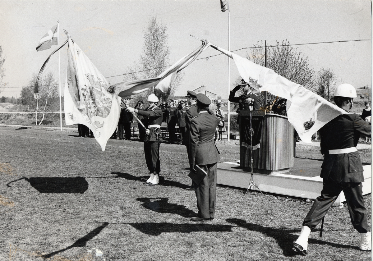 Fanöverlämning P 1 Göta livgarde, Enköping. Kungen Karl XVI Gustaf överlämnar fanan, 1975.