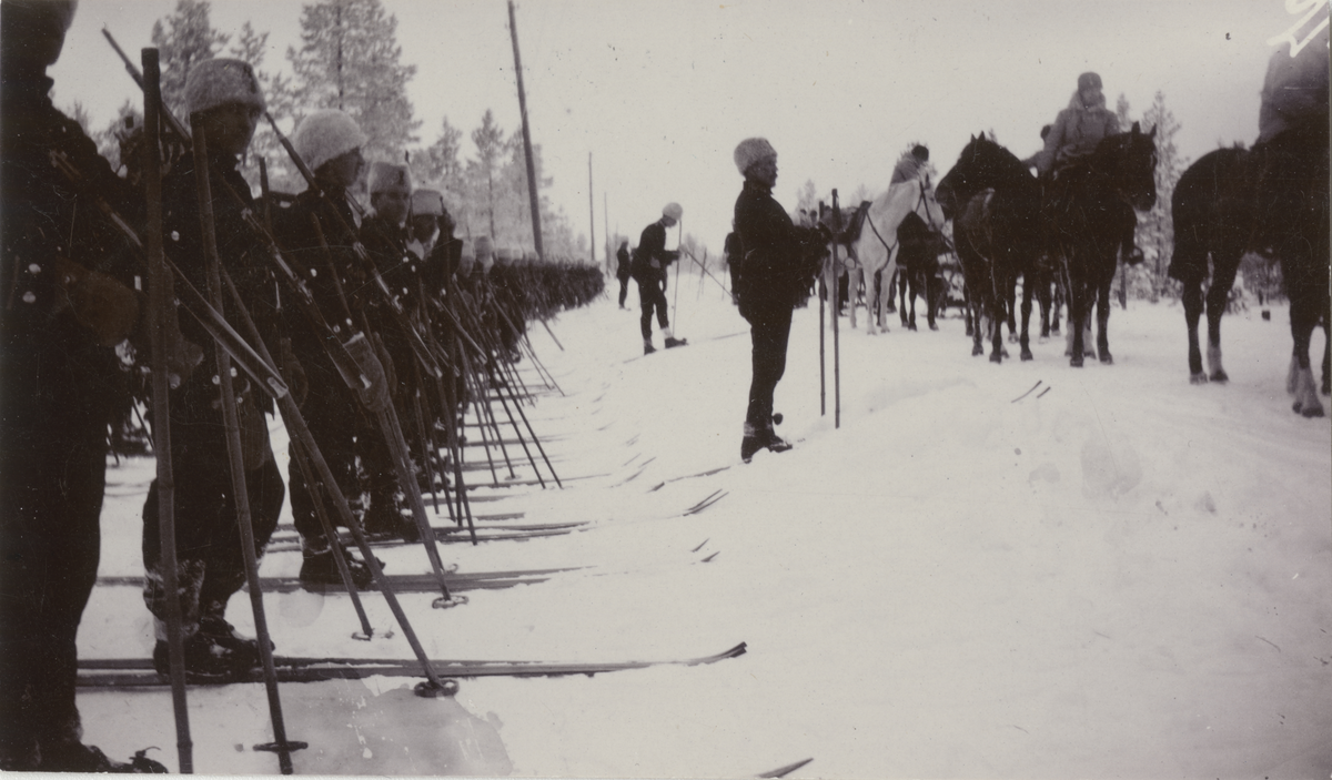 Vinterövningar på 1940-talet. Trupp på skidor längs en väg, beriden trupp på hästar i bakgrunden.