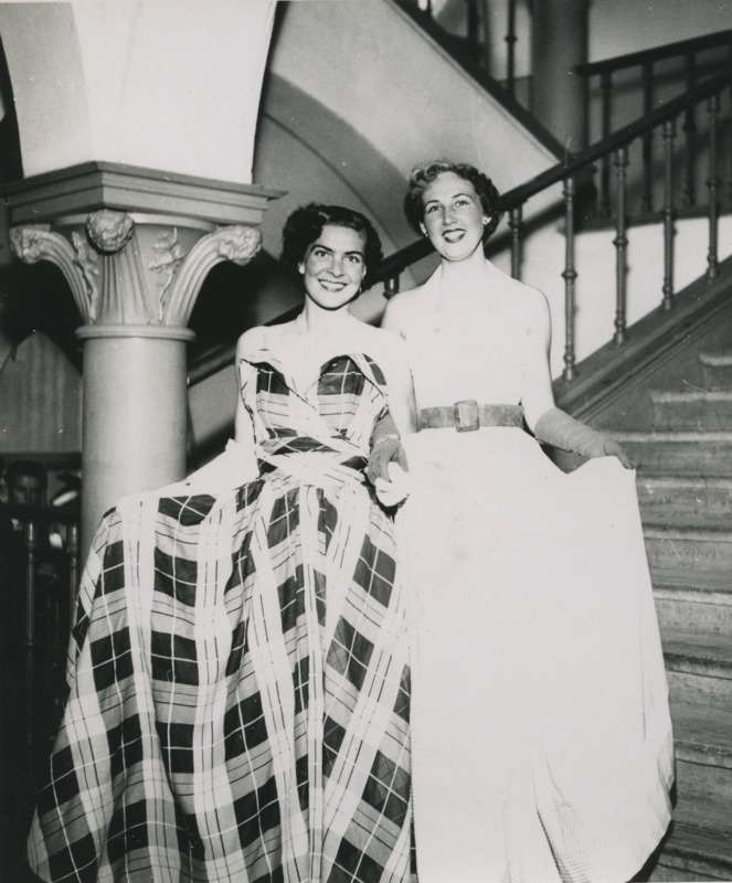 Svartvitt fotografi som visar två kvinnliga mannekänger på Öresundsmässan. Gertie Hense står står till höger i vit klänning.