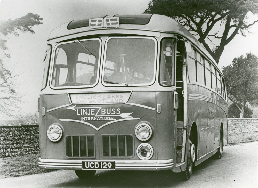 Svartvitt fotografi av buss tillhörande Linjebuss International. Fordonet är parkerat, möjligen på en rastplats eller liknande, med fören mot fotografen. Man ser även lite av bussens ena långsida, åt höger i bilden. Dörren, som är framme vid fören, står öppen. Bussen står lite snett i förhållande till den låga mur som syns bakom den. Längs med muren finns också en gräskant. På bussens för, under vindrutan, står det "English Lakes and Scotland". Under det finns Linjebuss logga. Ovanför vindrutan finns två små skyltar med en flagga på varje. Bakom bussen, och muren, syns ett flertal träd och buskar.