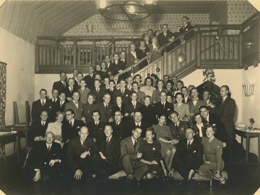 Svartvitt fotografi som visar ett gruppfotografi över personer som jobbar inom kläder. På bifogat blad står namn på personerna på bilden under rubriker som "Sport!, "Hatt" och "Kostym". Bilden ligger i en mapp.