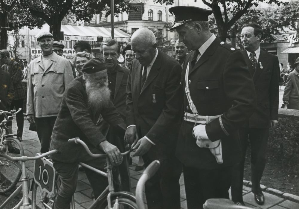 Svartvitt fotografi taget i samband med Kullagatans 10-års jubileum. Gustav Håkansson, kallad Stålfarfar, står vid sin cykel med Börje Skarstedt och polisen Stig Fenning.
