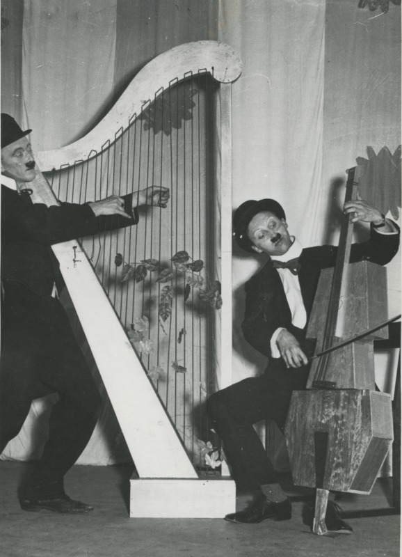Bilden visar två män från revyn Vårluft. Den ena spelar på en låtsasharpa och den andra en låtsascello.