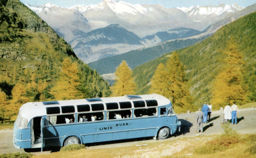 Vykort i färg som visar en av Linjebuss Internationals bussar i ett alplandskap. Bussen står på en väg i förgrunden med fören åt höger i bild. På bussens långsida finns Linjebuss logga. Genom bussens fönster skymtar passagerare på sittplatserna. Dörren i bussens bakre del står öppen. Fem, tillsynes manliga, passagerare står framför bussen och tittar ut över landskapet som utgör bakgrunden. Där syns alptoppar med snö och lägre berg med skog.