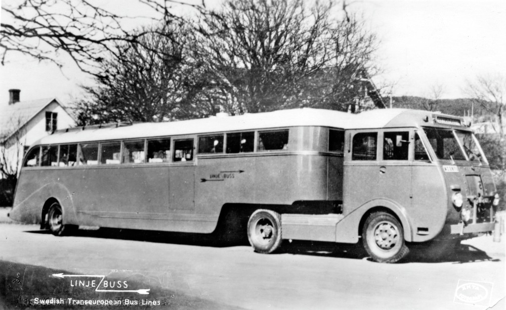 Svartvitt ykort som visar en av Linjebuss Internationals bussar. Bussen står på en väg med fören åt höger i bild. På bussens långsida finns Linjebuss logga. I bakgrunden, bakom bussen, skymtar en villa bakom en trädkrona. Vid bussens bakre del syns en annan villa.