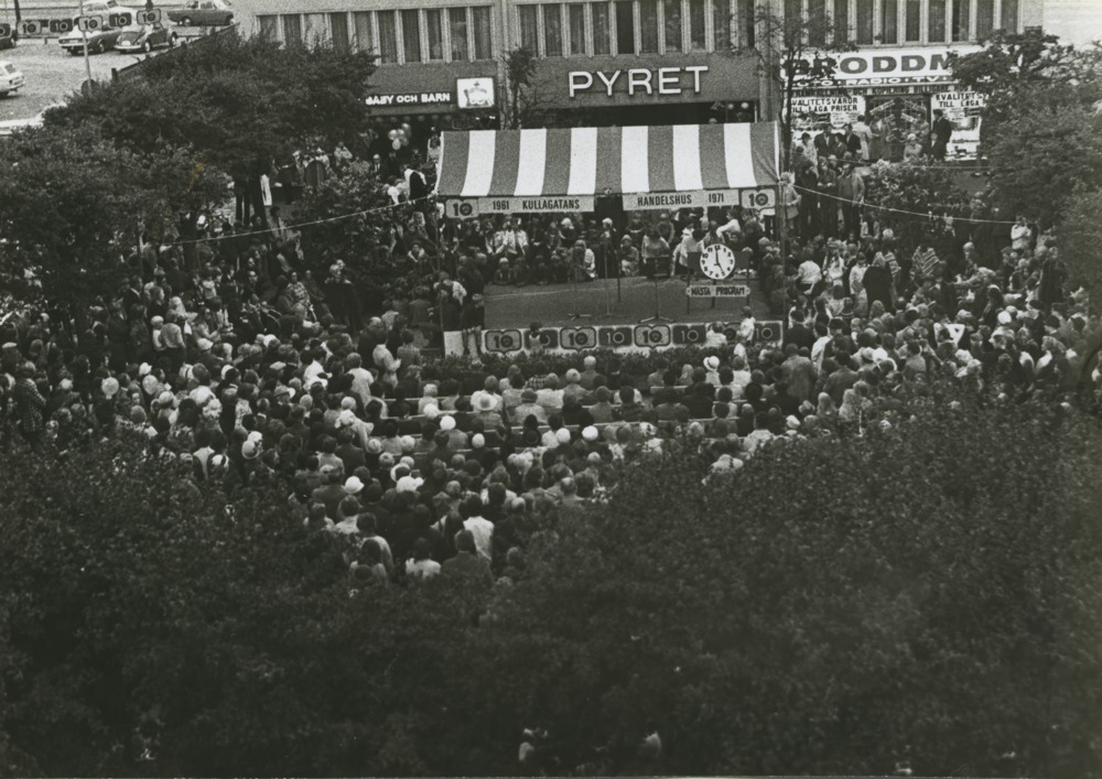 Svartvitt fotografi som visar folksamling under 10-årsfirande av Kullagatans 10 års jubileum.
