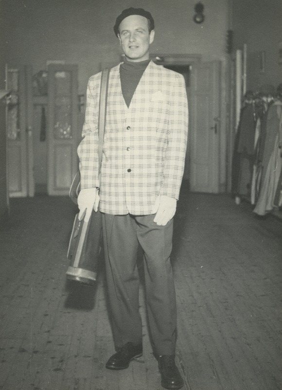Svartvitt fotografi av en man som troligen gör reklam för kläder från Bröderna Henses herrekipering.