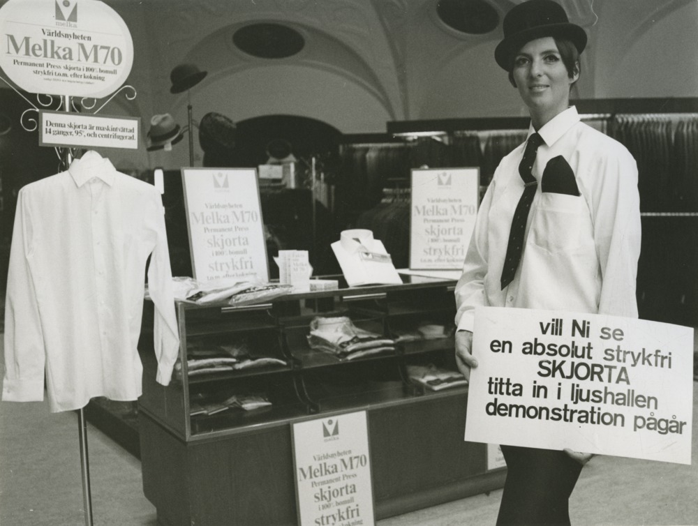 Interiört fotografi taget i Gustaf Krantz herrekipering.På bilden står en kvinna iklädd en vit skjorta, slips och hatt. Hon håller en skylt framför sig med texten: "vill Ni se en absolut strykfri SKJORTA titta in i ljushallen demonstration pågår". I bakgrunden finns flera skyltar som berättar om Melka M70 som är en strykfri skjorta.
