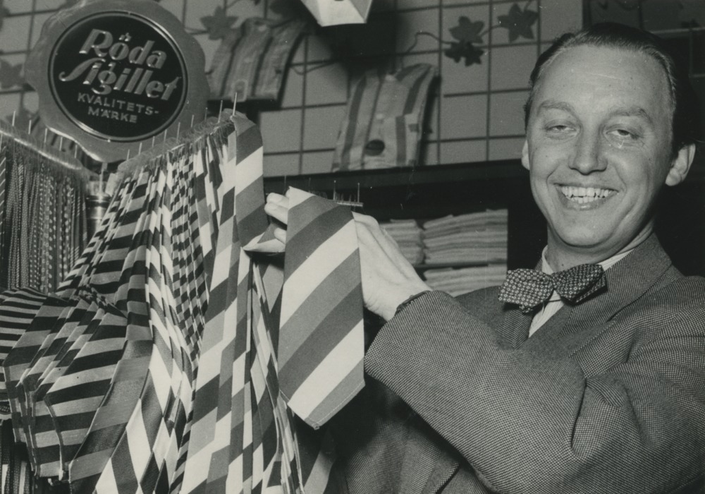 Svartvitt porträtt av Gösta Hense som håller upp slipsar av märket Röda Sigillet.