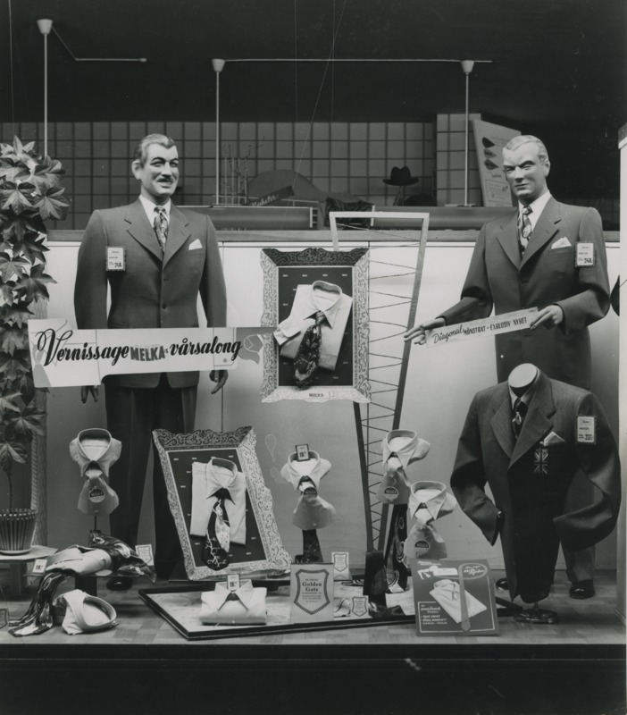 Svartvitt fotografi av skyltfönstret till Bröderna Henses herrekipering. I skylten gör man reklam för skjortan från Melka: "Vernissage MELKA-vårsalong". I skyltfönstret står två skyltdockor iklädda kostym.