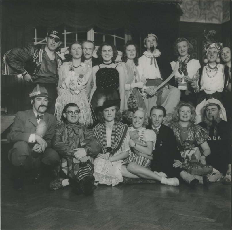 Grupporträtt av gäster på en maskerad hållen hos Lennart Hallberg.