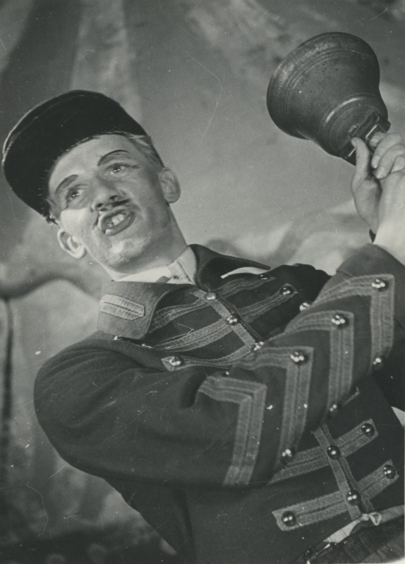 Bilden visar en man som ringer i en klocka, från revyn Vårluft.