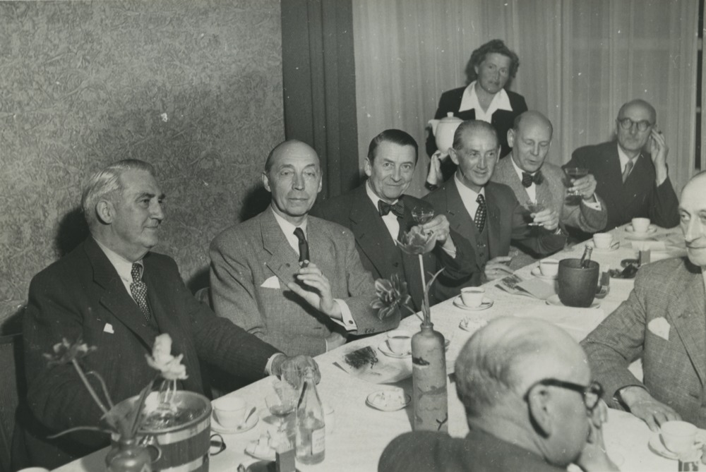 Svartvitt fotografi taget på Spångens Gästgivaregård 1952. En grupp män serveras kaffe av en kvinna. Tredje från vänster sitter Albert Hense.