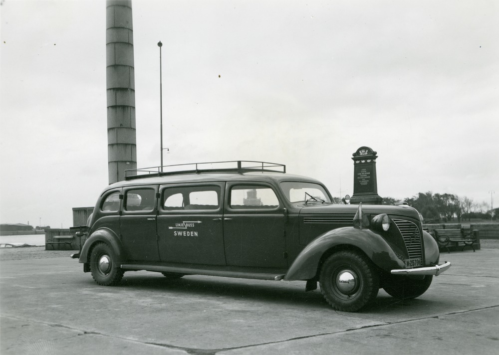 Svartvitt fotografi av mindre buss tillhörande Linjebuss International. Fordonet är parkerat på Hamntorget i Helsingborg, alldeles framför Bernadottemonumentet som syns bakom fordonets motorhuv. Till vänster i bild syns fundamentet och pelaren till Sjöfartsgudinnan. Fordonet står med fören åt höger i bild. På sidan har den tre dörrar. På dörren i mitten finns Linjebuss Internationals logga och under den står det "Sweden". I bakgrunden skymtar Parapeten och fyrhuset.