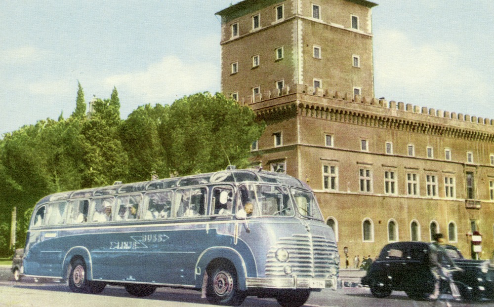 Vykort i färg som visar en av Linjebuss Internationals bussar i en stadsmiljö. Bussen står på en väg, eller en parkering, med fören åt höger i bild. Det ser ut som att det också finns en mindre släpvagn efter bussen. Framför bussen kör en mörk bil och en cyklist utåt höger i bild. I bakgrunden, åt vänster, växer träd och åt höger finns en stor byggnad.