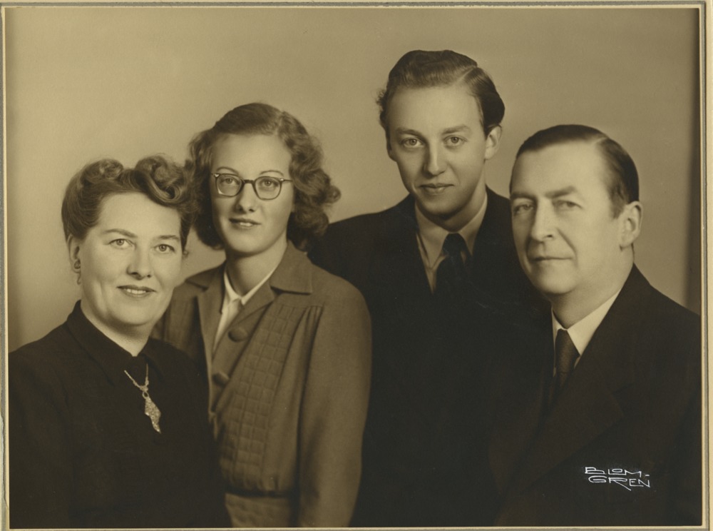 Familjeporträtt av familjen Hense i mapp. Från vänster: Emma, Birgit, Gösta och Albert.