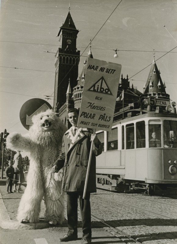 Svartvitt fotografi av två män som gör reklam för Henses polarpäls. Den ena är utklädd till en isbjörn som den andre håller i med en kedja. I handen håller han en skylt på vilken det står: "HAR NI SETT Libo och Henses POLAR PÄLS MODET SOM KOMMER". I bakgrunden syns Rådhuset och spårvagn nummer 5.