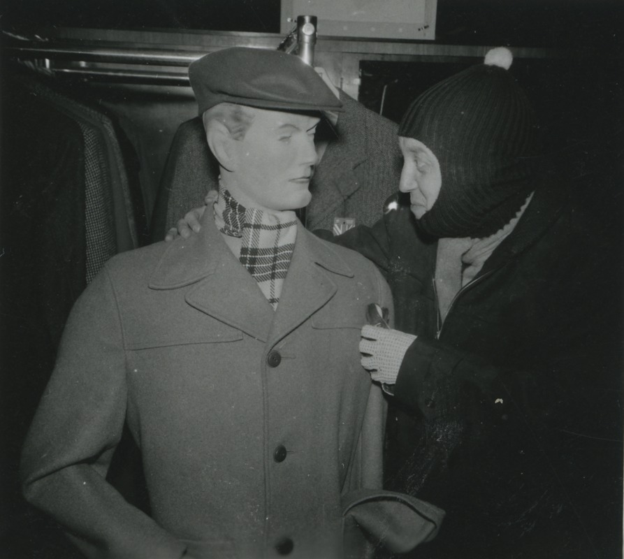 Svartvitt fotografi av Gösta Hense som tittar på en skyltdocka.