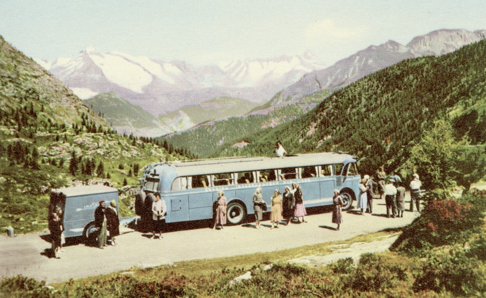 Vykort i färg som visar en av Linjebuss Internationals bussar i ett alplandskap. Bussen, som även har en släpvagn, står på en väg i förgrunden. Passagerare står utspridda runt den. I bakgrunden syns alptoppar med snö och lägre berg med skog.