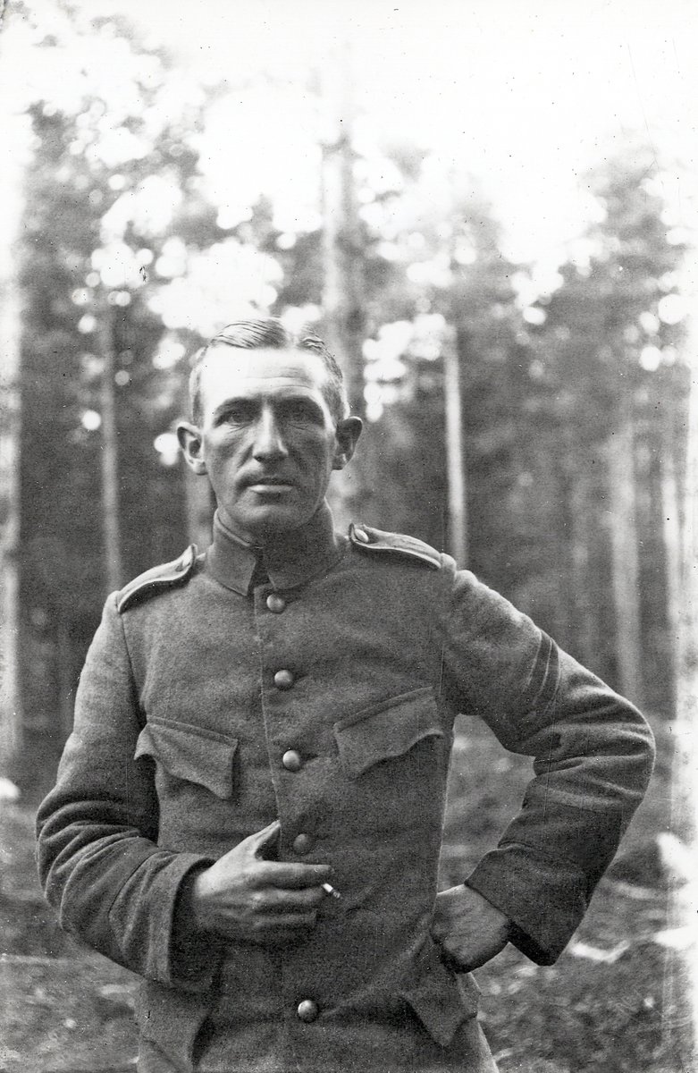 En man i uniform med en cigarett i handen, i ett skogsbryn.