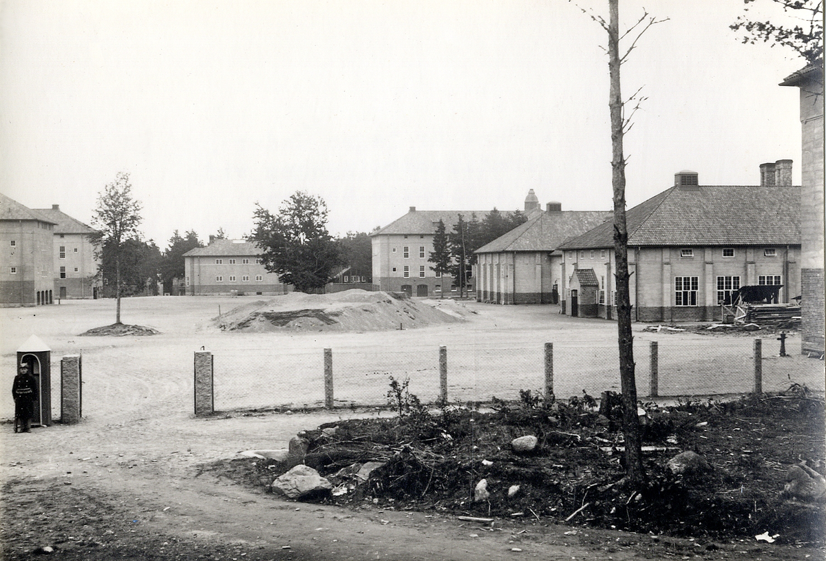 Vy över regementet från väster. En man står på vakt vid dåv. infarten.
