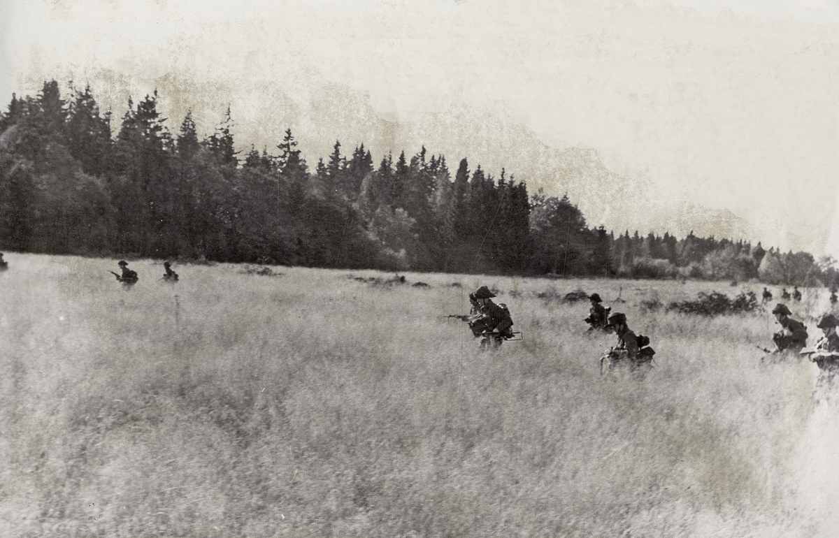 Kompaniövning, skkomp. Skplut framrycker på skyttelinje.