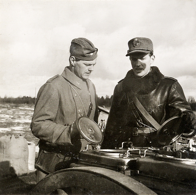 Utbildning i motortjänst. Två mannar diskuterar något i en motor.