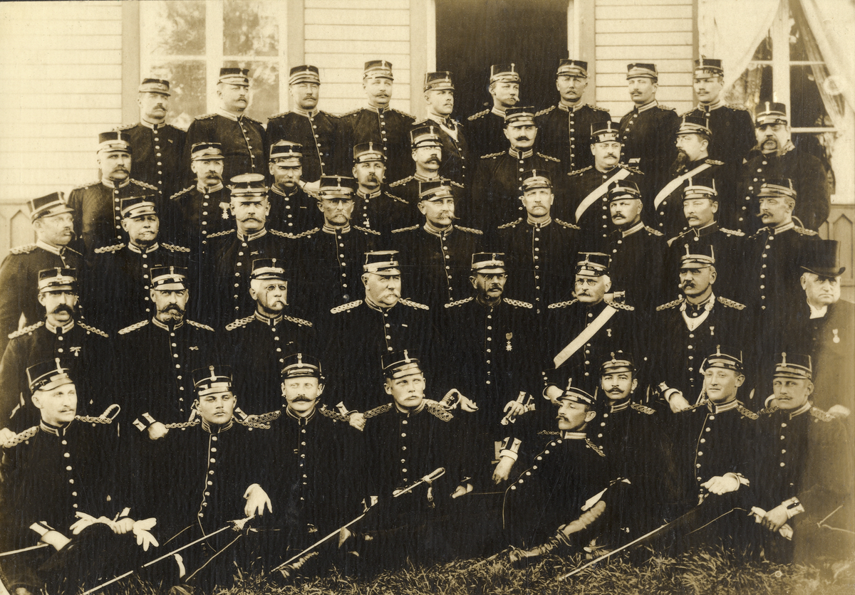 Regementsofficerare på Kungl. Kronobergs regemente utanför ett brädpanelat hus, ca 1893. Även regementspräst och -läkare.