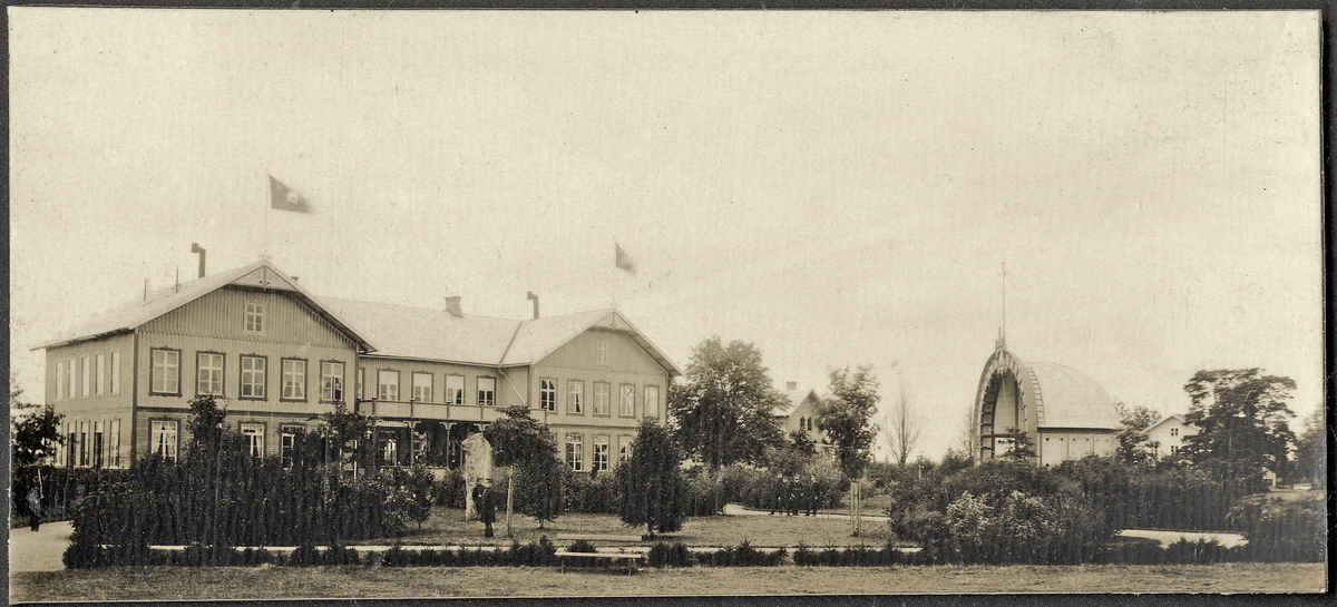 Officersmässen med musikpaviljongen på Kronobergs hed, ca 1895. Man skymtar några officerare i den lilla parken.