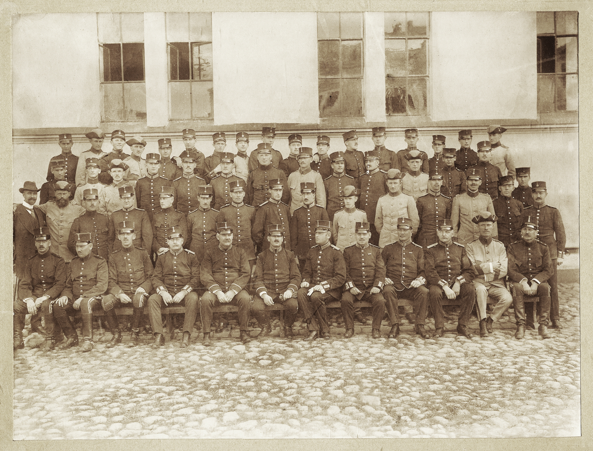 De är klädda i en blandning av m/95 och m/06-10. Till vänster en civilklädd man.