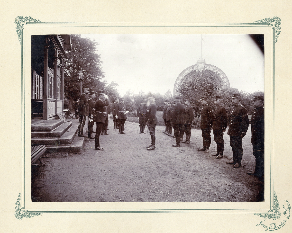 Generalmajor Bråkenhielm besöker Kronobergs hed 1901. Några distinktionskorpraler m.fl. har samlats framför