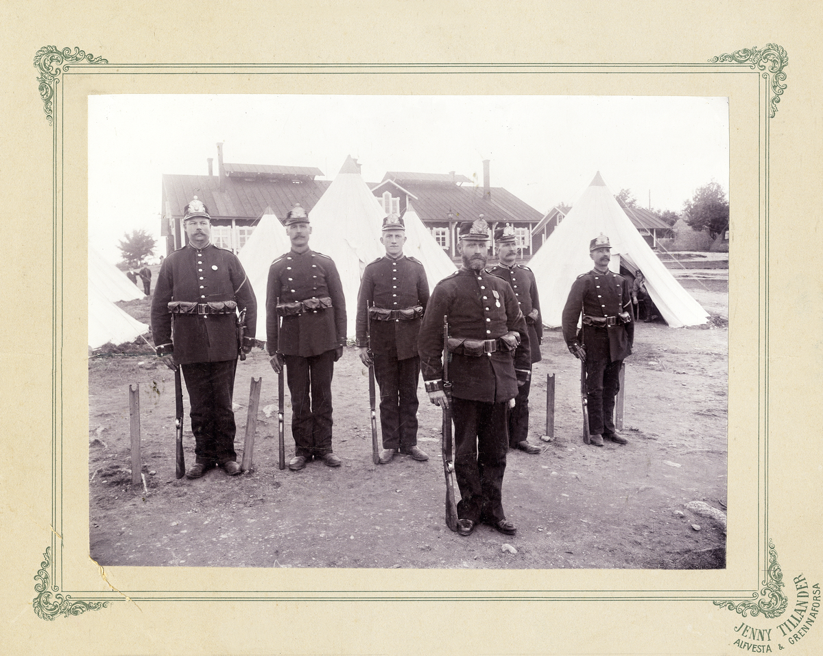 Lägervakten på Kronobergs hed framför sina vita vakttält. ca 1895.