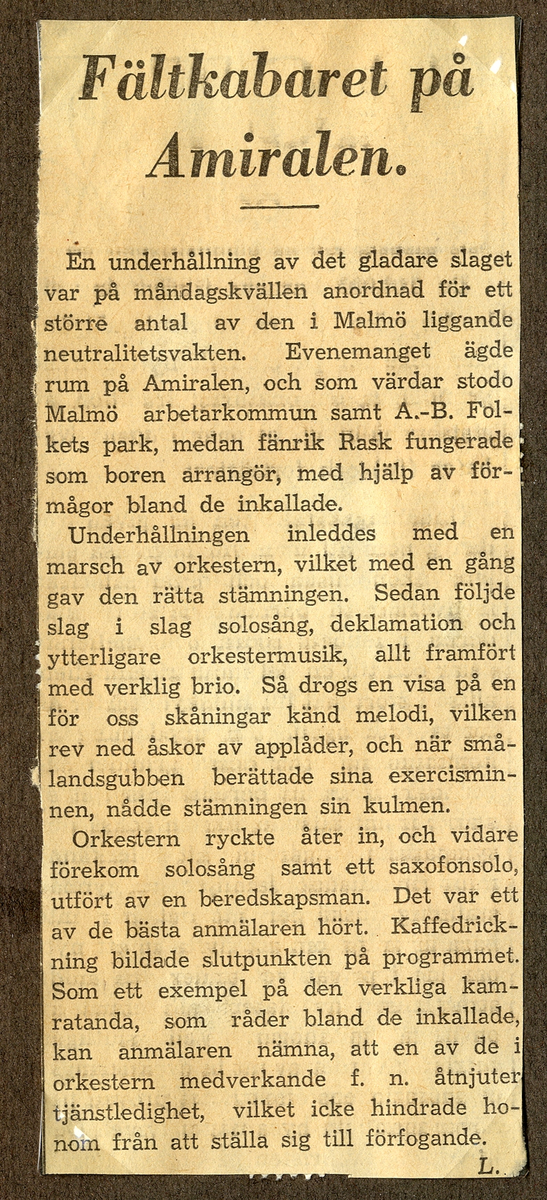 Recension/redogörelse för en fältkabaretföreställning på dansstället Amiralen, Malmö.
