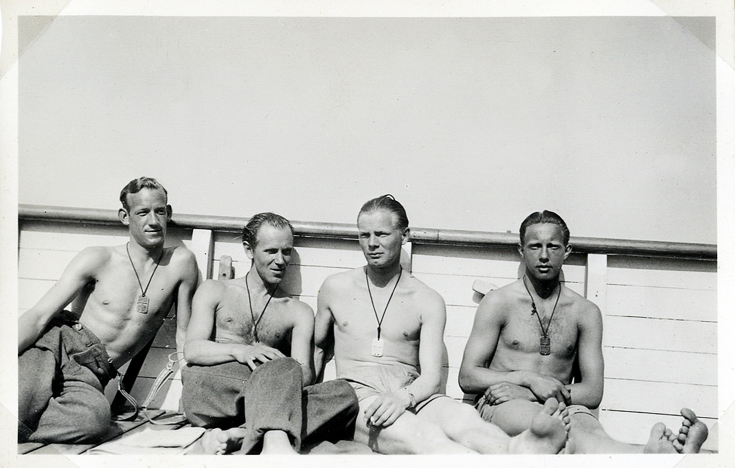Fyra mannar sitter och solar mot en träbarriär (Ribersborg, Malmö ?).