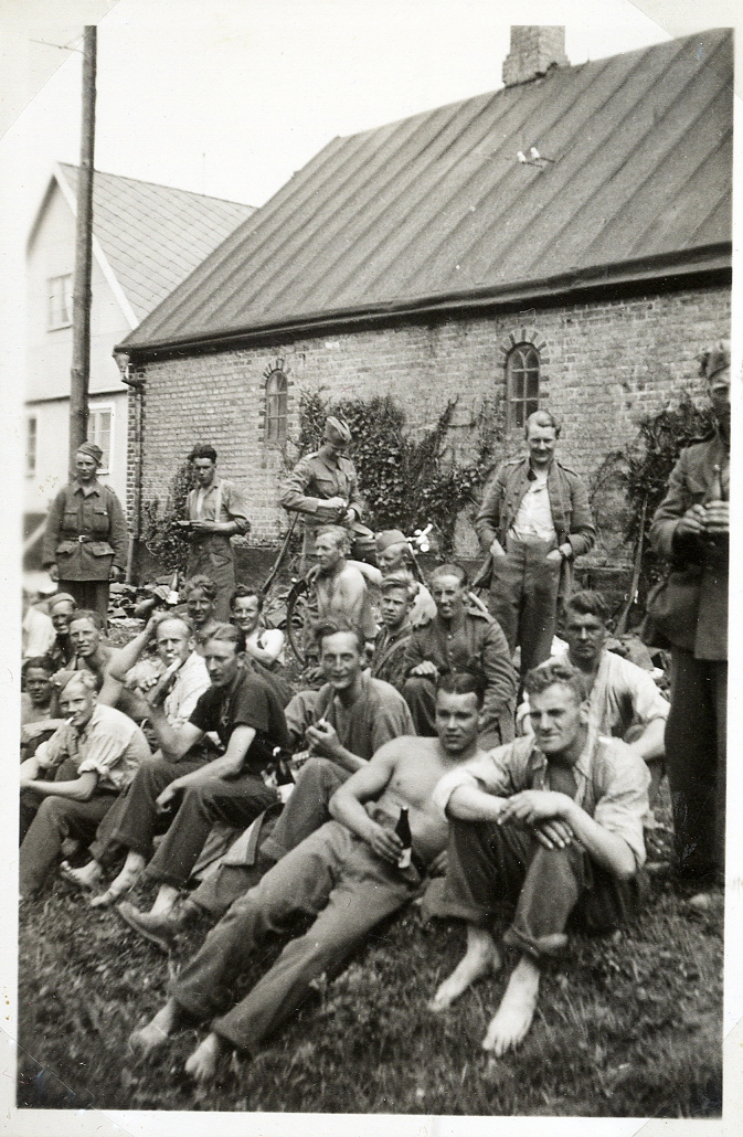 En pluton har rast och vila vid en grässlänt utanför en bondgård, någonstans i Skåne.