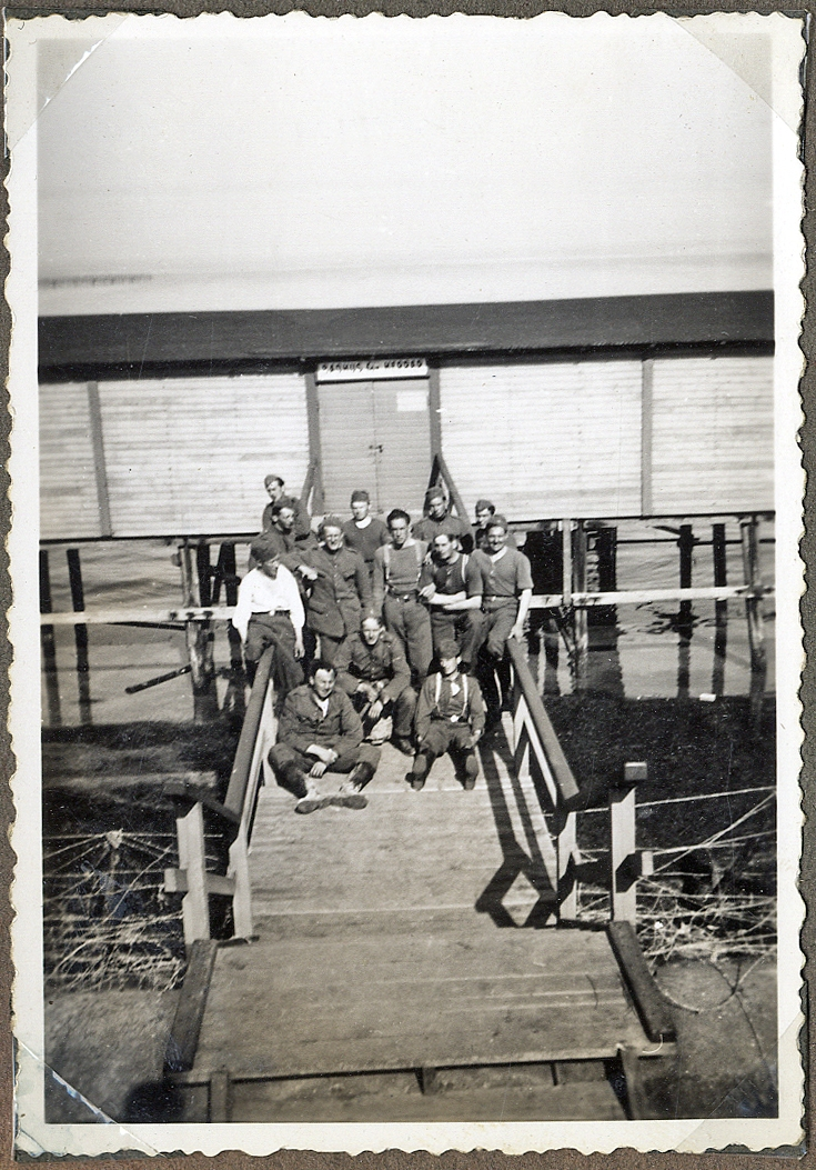 Några mannar har slagit sig ner på bron som leder över till en magasinsbyggnad (?) på pålar.