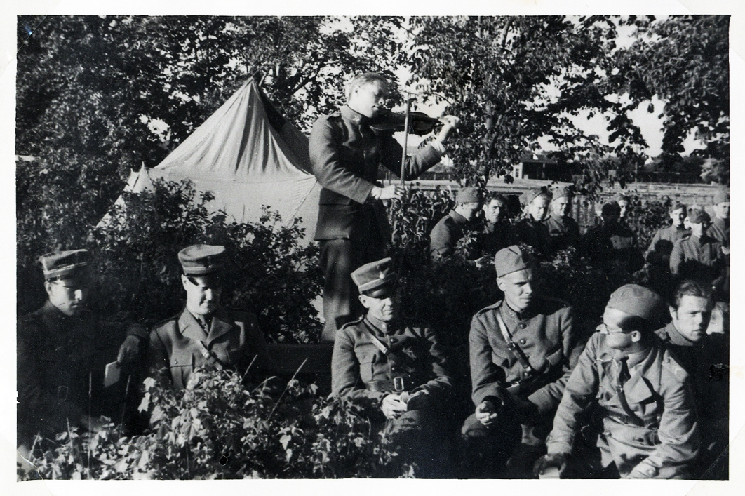 En man spelar fiol bakom några officerare. Till höger skymtar resten av den intresserade publiken.
