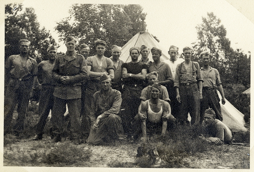 Ett antal mannar har ställt upp sig framför ett militärtält.