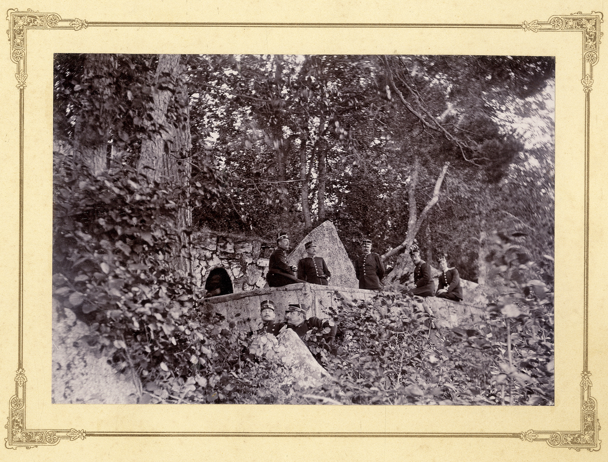 Några officerare har samlats vid den s.k. Kettils grotta (från 1802) i Rosersbergs slottspark.