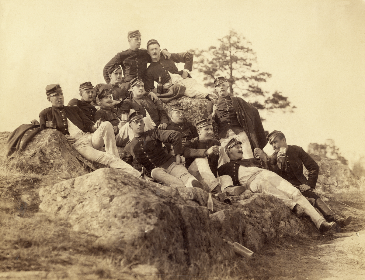 En grupp husarer(?) i m/72 har slagit sig ner för rast bland några bergsknallar.