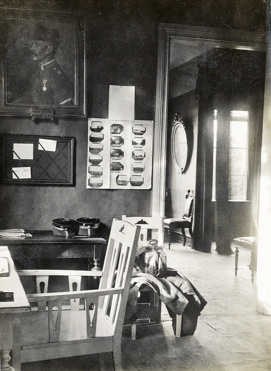 Skrivrummet i den s.k. Officersborgen. På väggen syns ett porträtt av indelte distinktionskorpralen A.J. Dahl, avmålad 1908 av bataljonsläkaren Adolf Drougge.