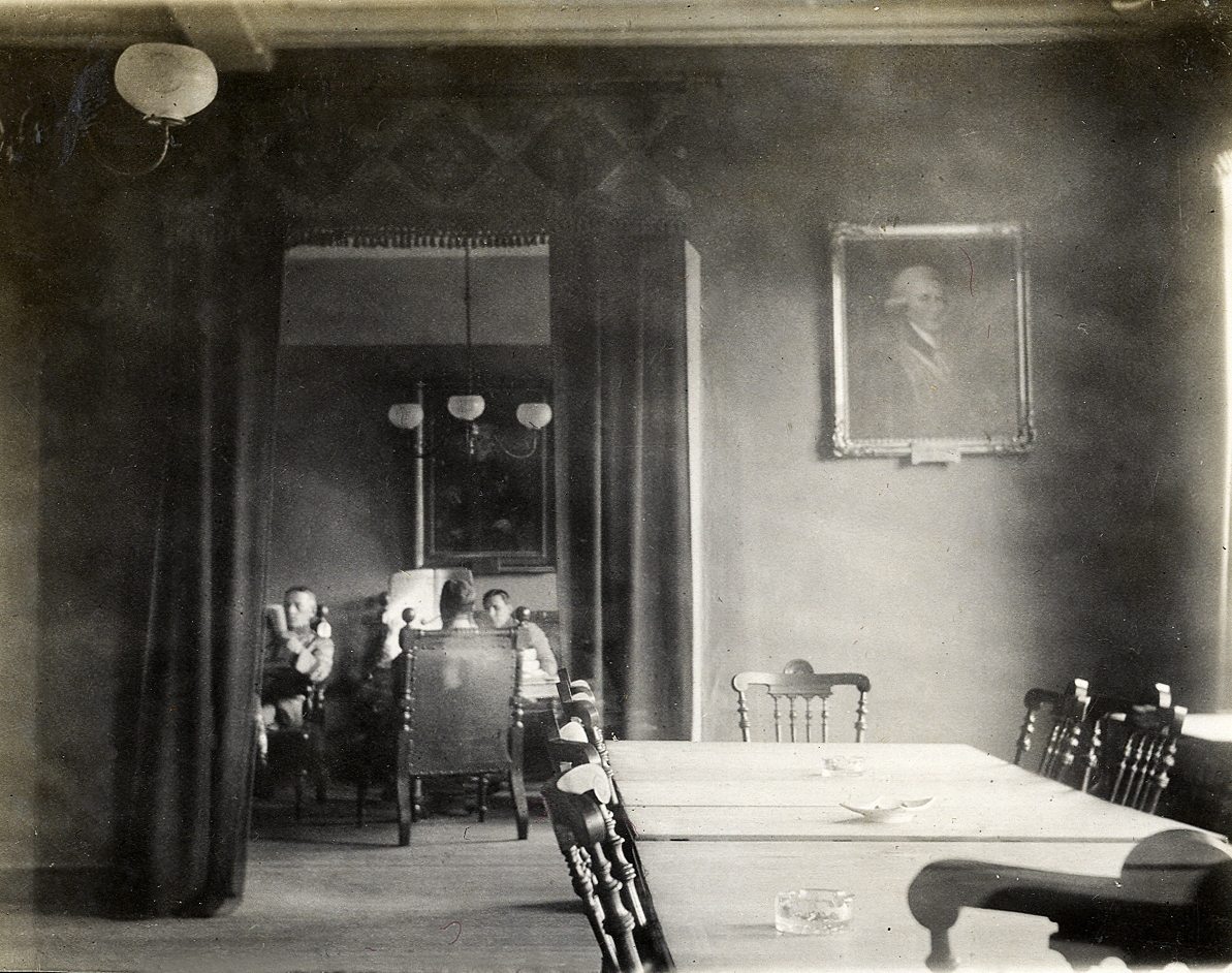 Två rum (rökrum och "punschrum") i Officersborgen. I det bortre rummet syns tre officerare som läser div. tidningar.