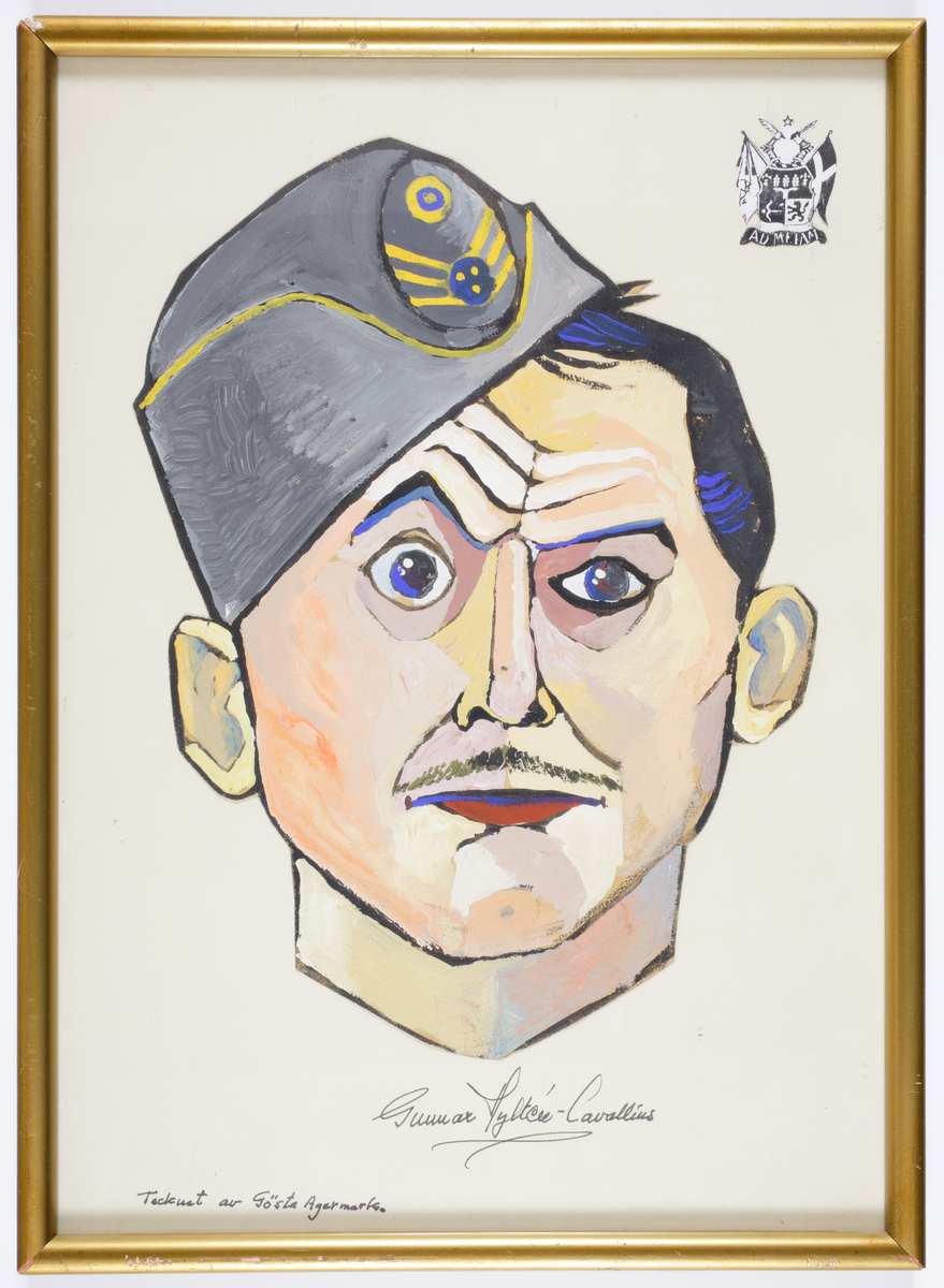 Karikerat porträtt av Gunnar Hyltén-Cavallius, utfört ca 1940 av överstelöjtnant Gösta Agermark (1917-2001).