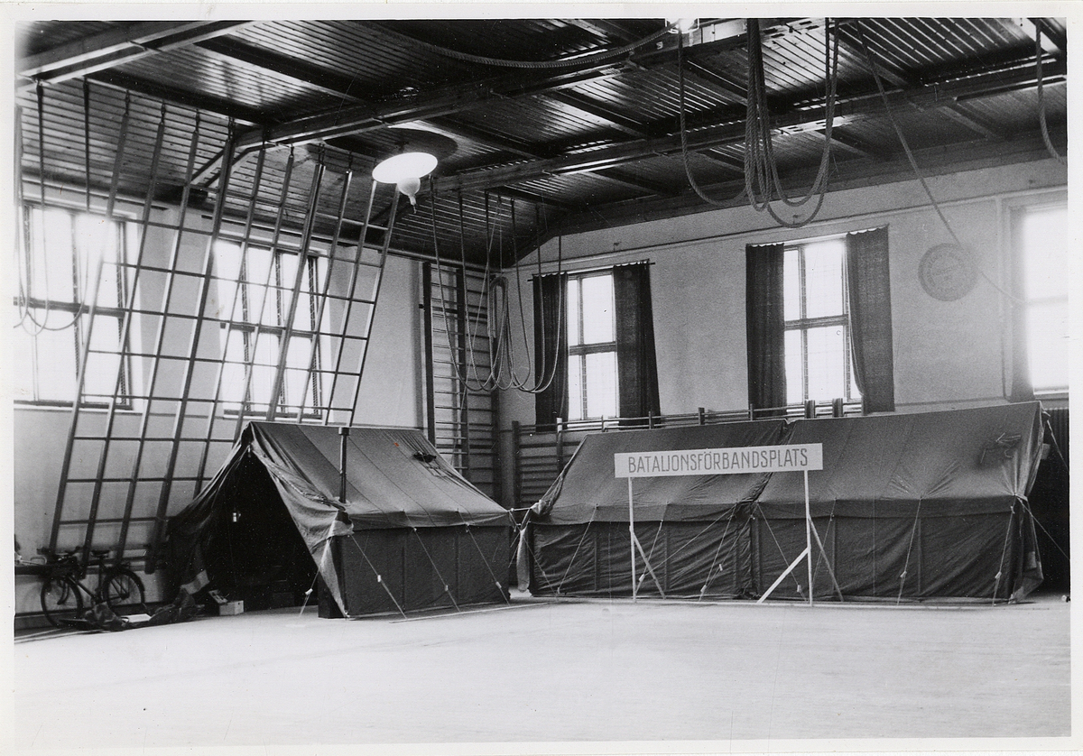 Utställning i gymnastiksalen, I11. Information om sjukvårdstjänsten i fält. En uppbyggd bataljonsförbandsplats med sjukvårdstält m.m..
