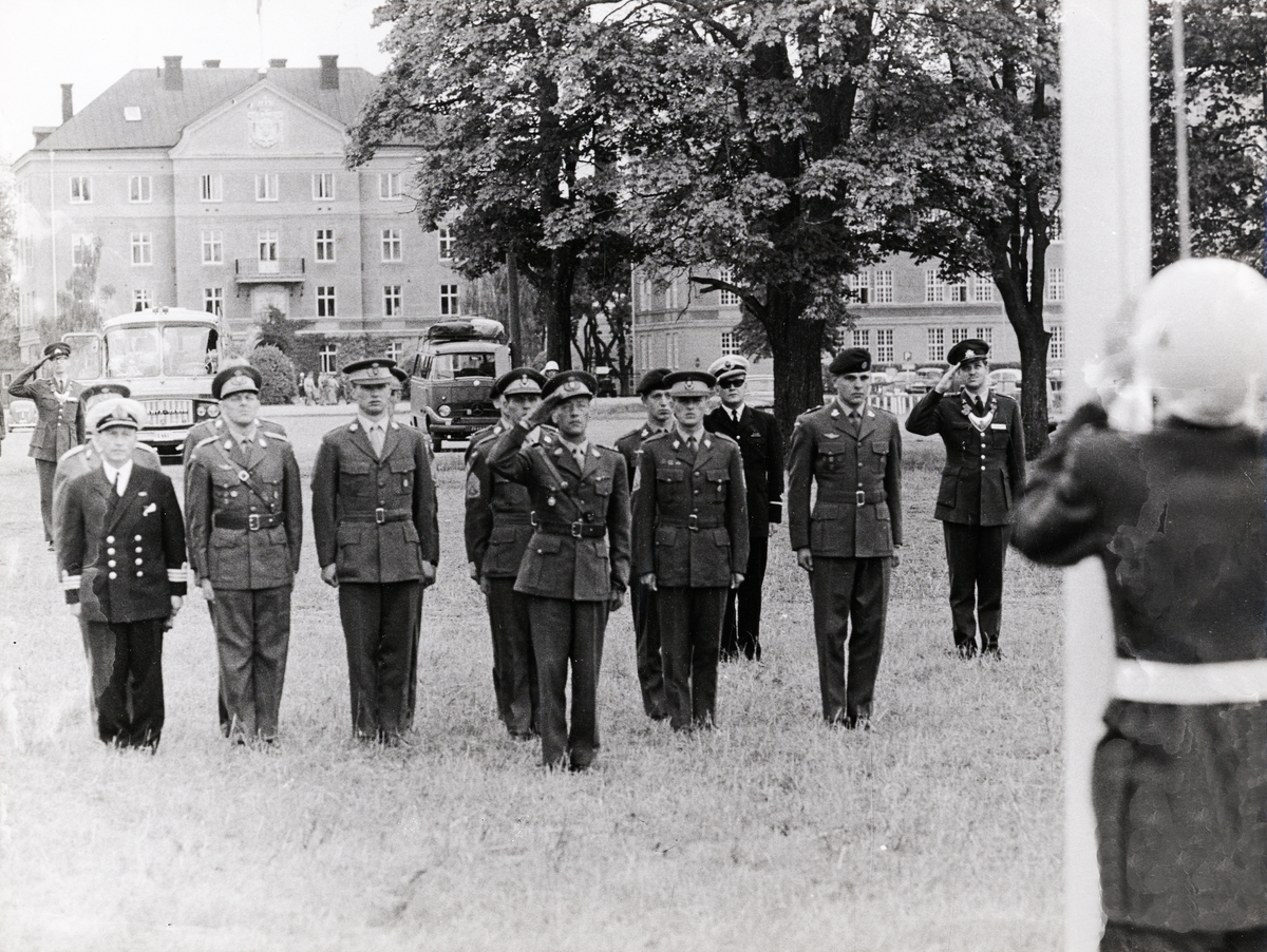 Titel: VM i militär femkamp. Uppsala 1967. (världsmästare: Bengt-Åke Christensson, I11). Parad för fanan.