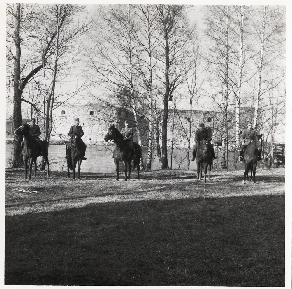 Sista motionsritten våren 1959, innan regementets hästar avvecklades. Deltagare vid ritten till bl a Kronobergs slottsruin: överstelöjtnant Anderberg. kaptenerna Råsbäck, Remberg, Håkansson, löjtnant Carlsson, fänrikarna Klinthof och Carlsson.