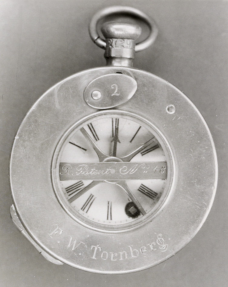 Kontrollur/fickur i mässing, med romerska siffror. Märkt "F.W. Tornberg, R. Patent No 48".