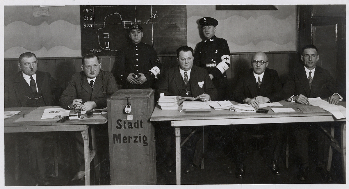 Omröstningslokalen i Merzig den 13/1 1935. Några myndiga herrar har satt sig bakom borden. Bakom dem syns två uniformerade män, en polis (?) och en sjukvårdare (man hade varnat för oroligheter).